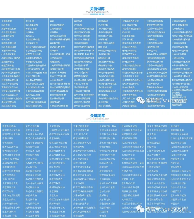 既然做营销,必须要明确我们的客户群体是谁?我们要根据产品的属性结合用户的搜索习惯锁定目标客户,建立有效的关键词库。我们就拿养老机构面对的客户确定进行分析。无论您是做经营养老院还是提供其他的养老服务,核心关键词就是“养老”。养老一词很泛,我们需要结合语义、用户的目的、搜索的习惯具体化关键词。